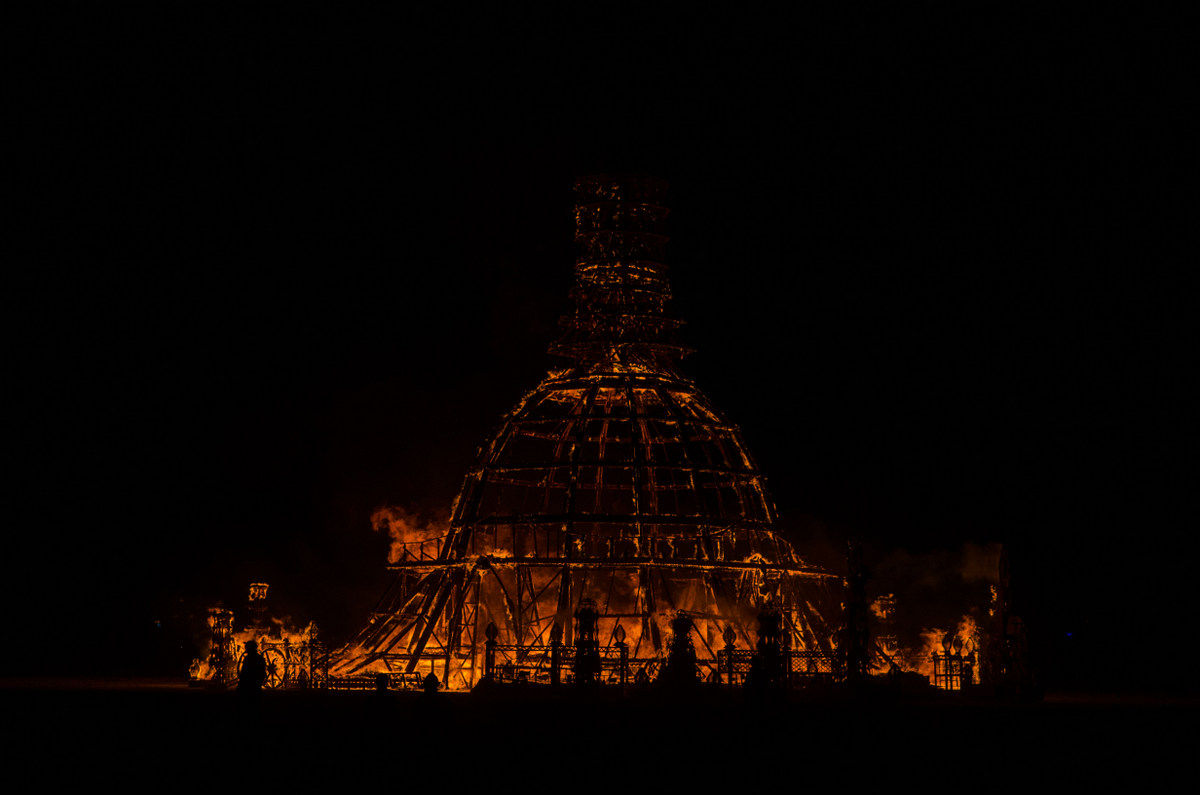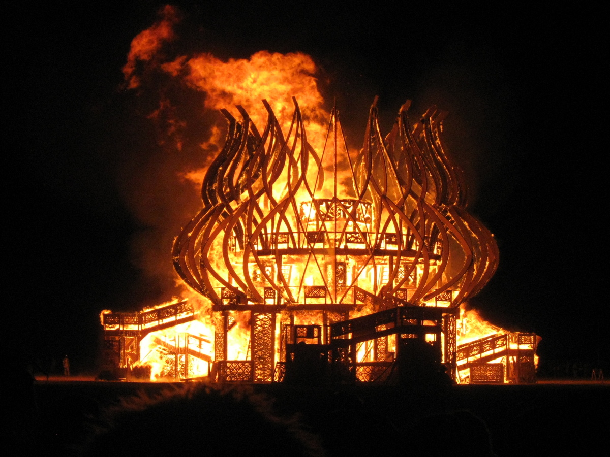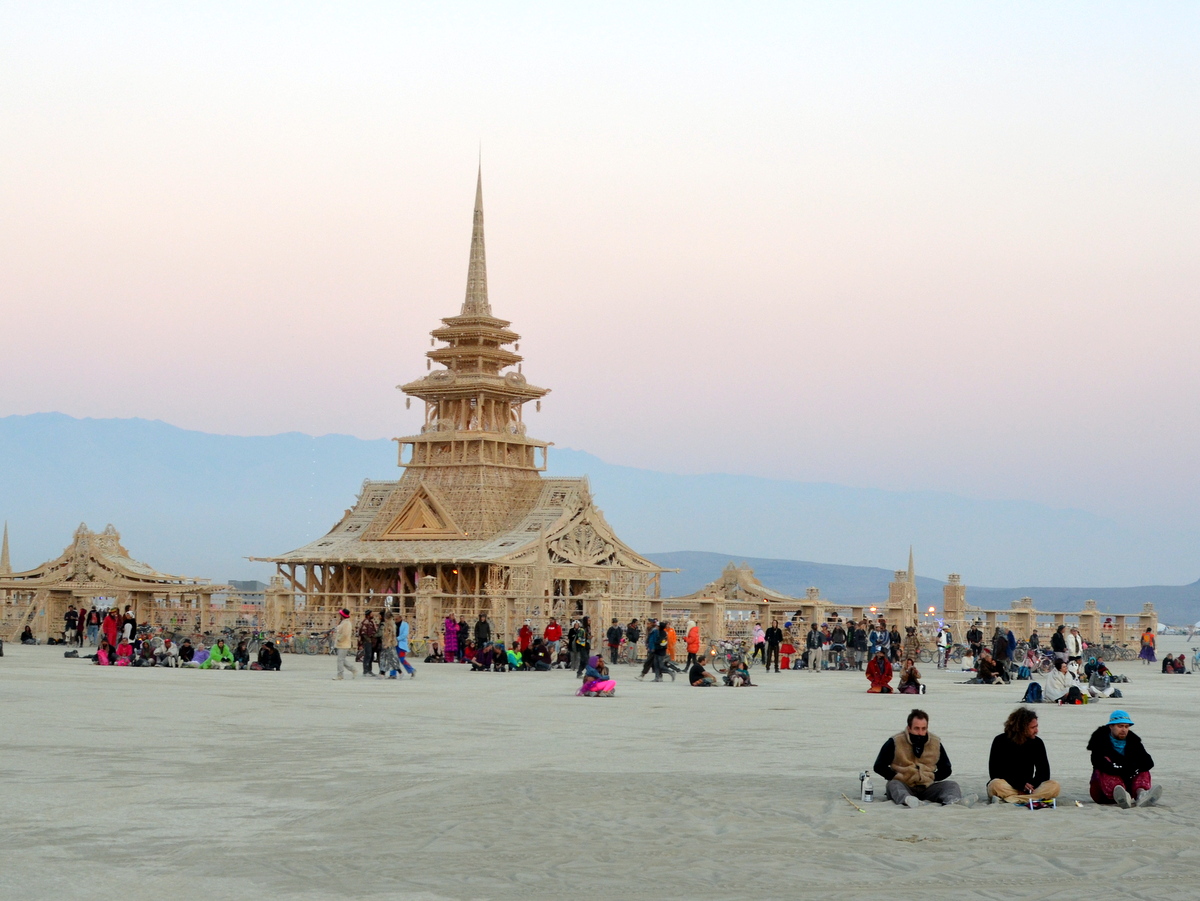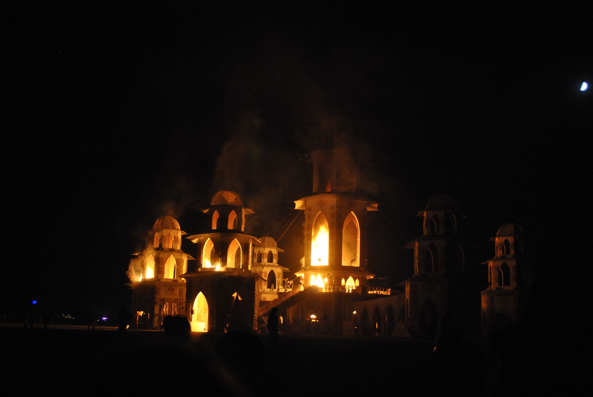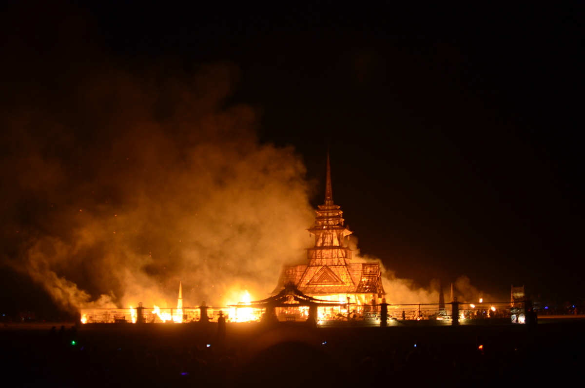 За мои предыдущие девять раз, я оставался чтоб посмотреть на эту церемонию все кроме одного. Пока люди ждут, давайте посмотрим на храмы прошлых лет. Большинство из них кажутся мне невероятно красивыми. То что за несколько месяцев их проектируют и строят тут в пустыне, лишь с тем, чтоб сжечь через неделю после завершения кажется очень странным. Но в этом суть Бёрнинг Мэна.