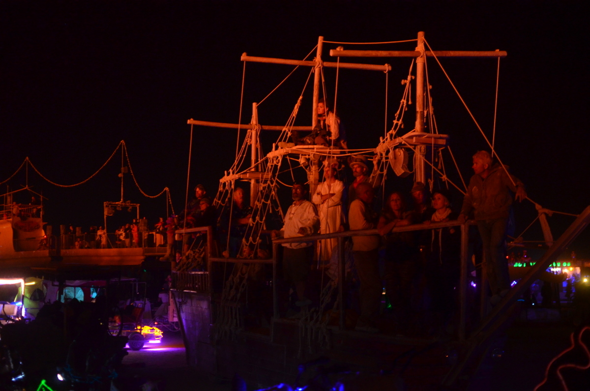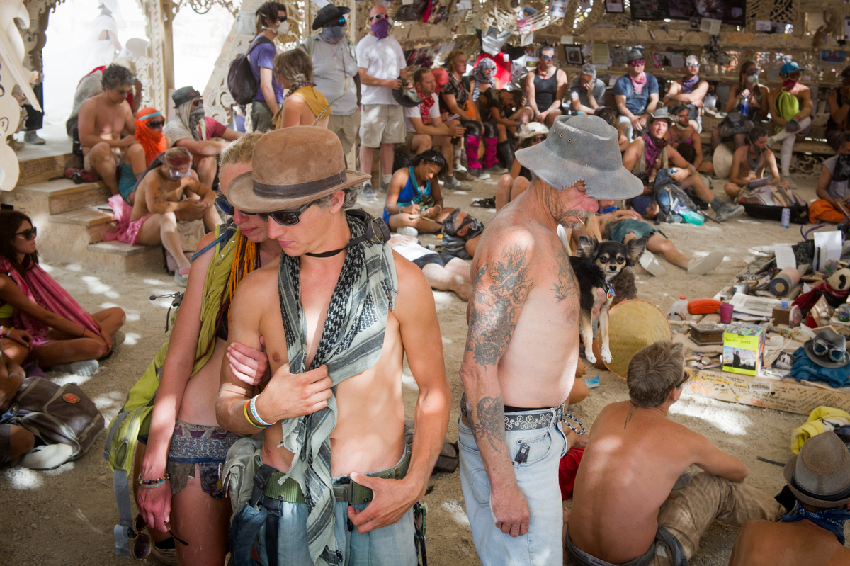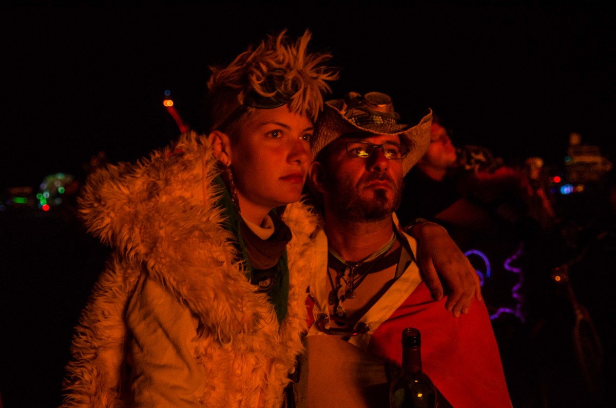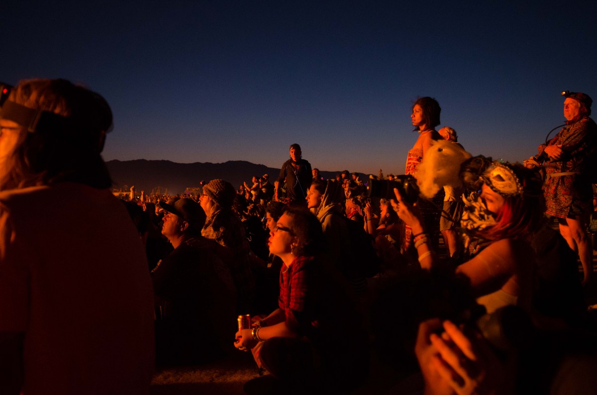 После заката все оставшиеся бёрнеры собираются вокруг Храма. В принципе это сборище похоже на то, что вчера было вокруг Мэна, но с другой стороны очень сильно отличается. Самое главное - здесь тихо. Нет не музыки, не улюлюканья, ни смеха. Все сидят и молча смотрят на Храм, ждут начала сжигания. Даже мигающих лампочек, неона, подсветки, всего этого тут по минимуму. Если сжигание Мэна - весёлый праздник, то в случае Храма это печальная и духовная церемония. Скажу честно, мне это гораздо больше по душе.