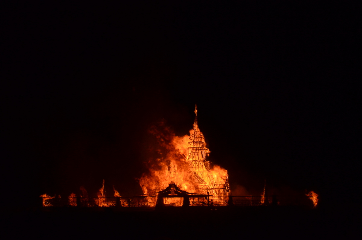 Если поджигание Мэна сопровождалось плясками с огнём, салютами и гигантскими взрывами, то тут нет ничего подобного. Максимум церемонии на которую можно рассчитывать, это молчаливый обход Храма людьми с подожжёнными факелами. Потом они швыряют огонь внутрь здания, и оно быстро воспломеняется.