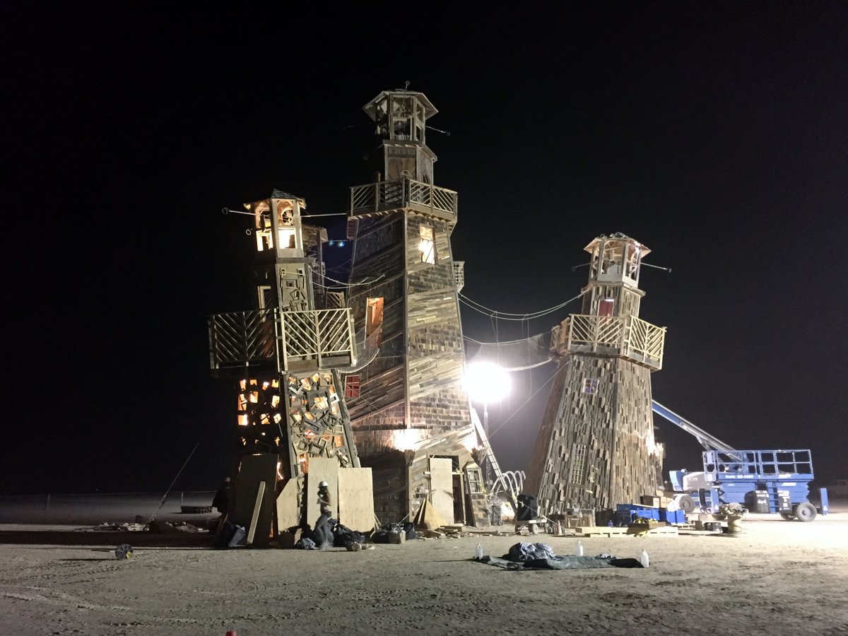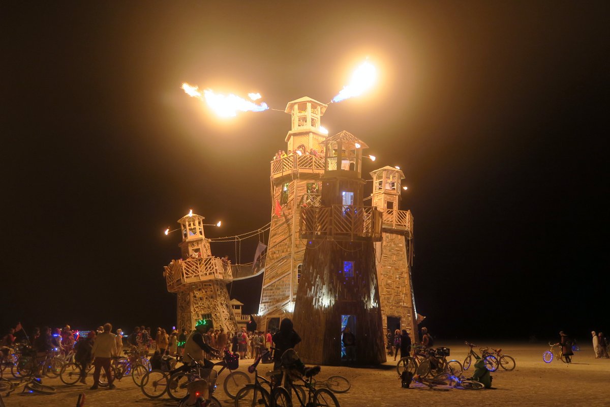А вот Blackrock City Lighthous Service. Эти маяки тоже не закончили к открытию, и команды строителей отлаживали и украшали их пару дней после нашего приезда. Работы велись круглосуточно.