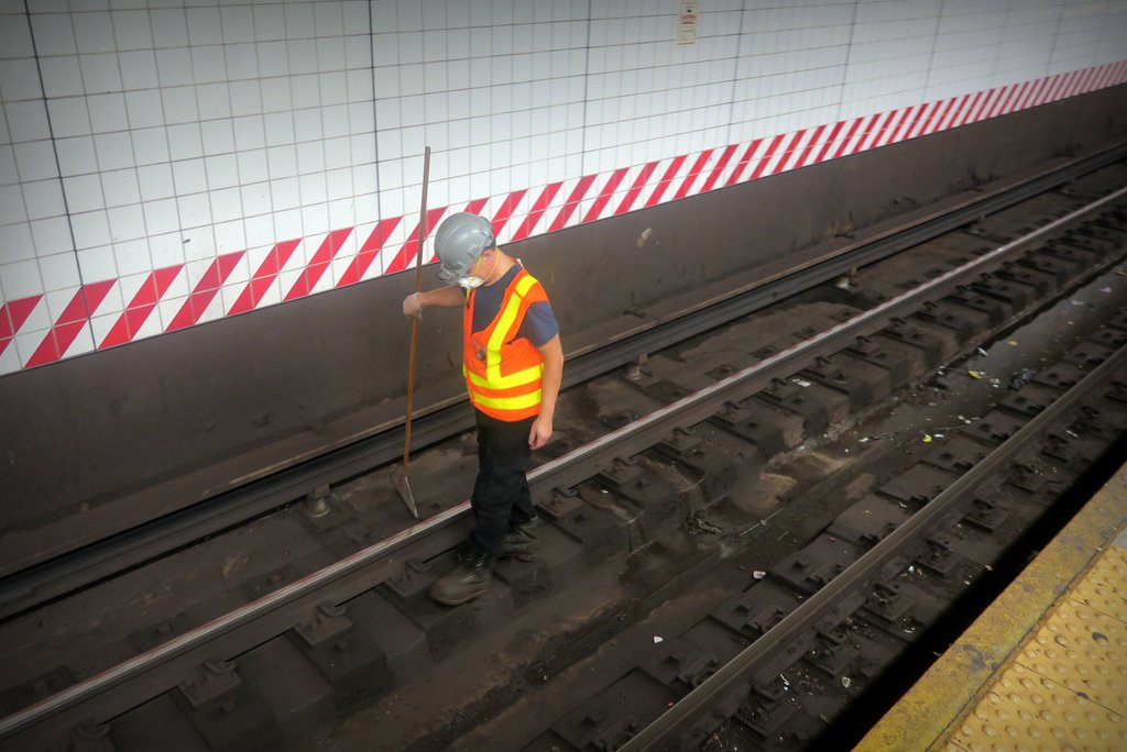 Ну не суть. Станции грязные, и их надо все почистить. Как же наш доблестный MTA планирует выполнить такой геркулесовый подвиг в столь короткие сроки? Может у них есть какая-то специальная чудо машина? Вовсе нет! Просто чуваки в ярких оранжевых спецовках ходят по рельсам собирая мусор.