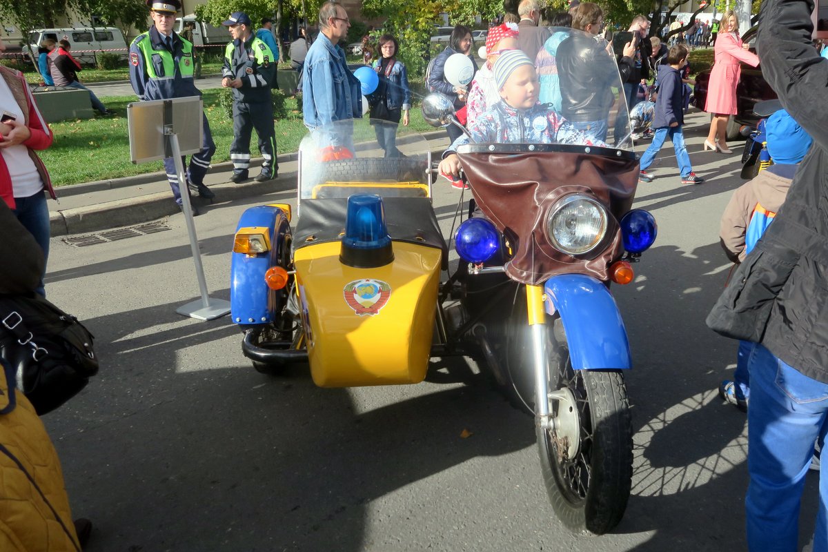 И конечно же классический милицейский мотоцикл с коляской. Всё это можно было потрогать, посидеть, пофотографироваться, что люди делали охотно.