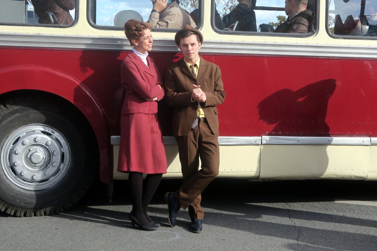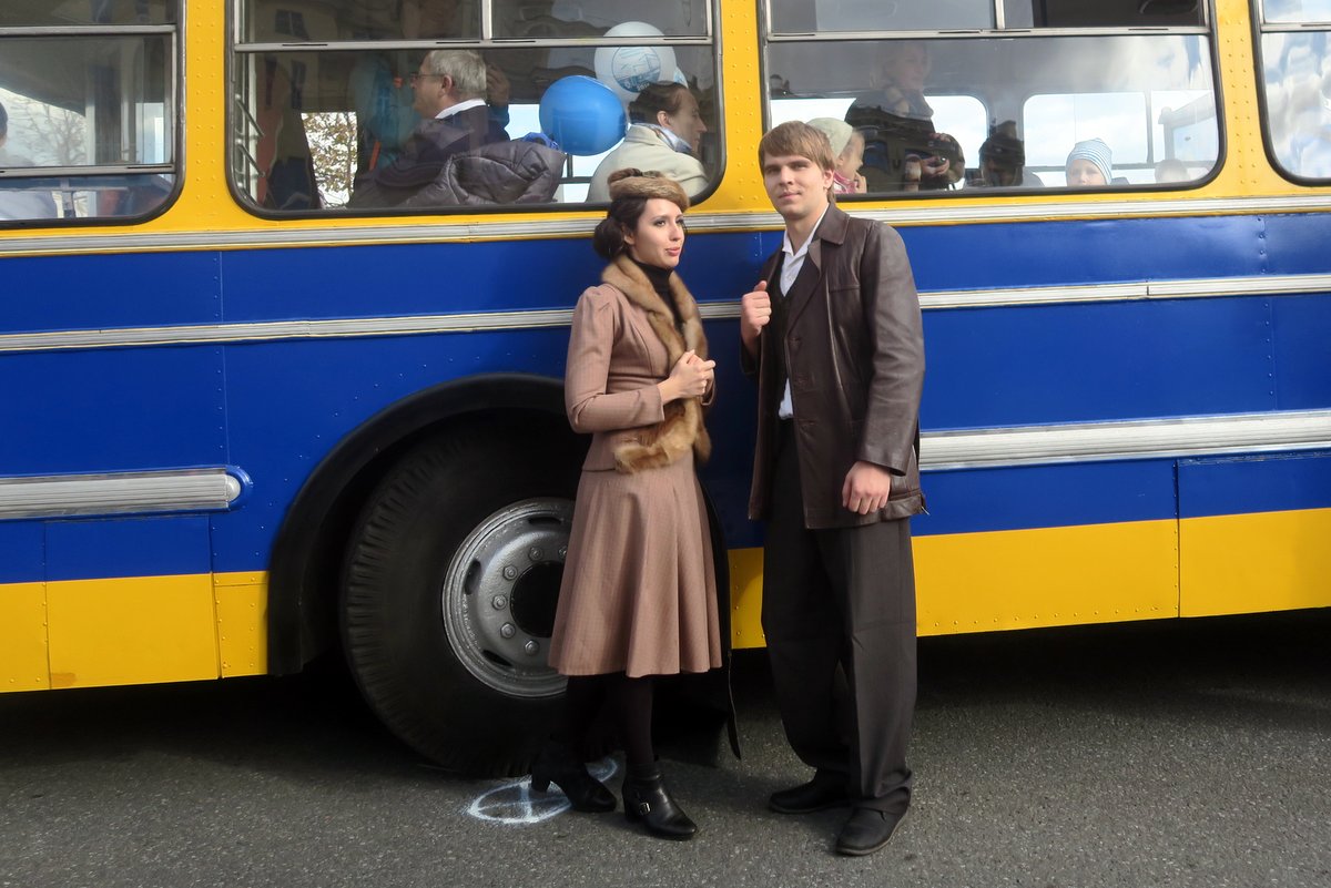 Рядом с некоторыми троллейбусами стояли молодые люди, одетые по моде времени, когда данная модель ходила по улицам города.
