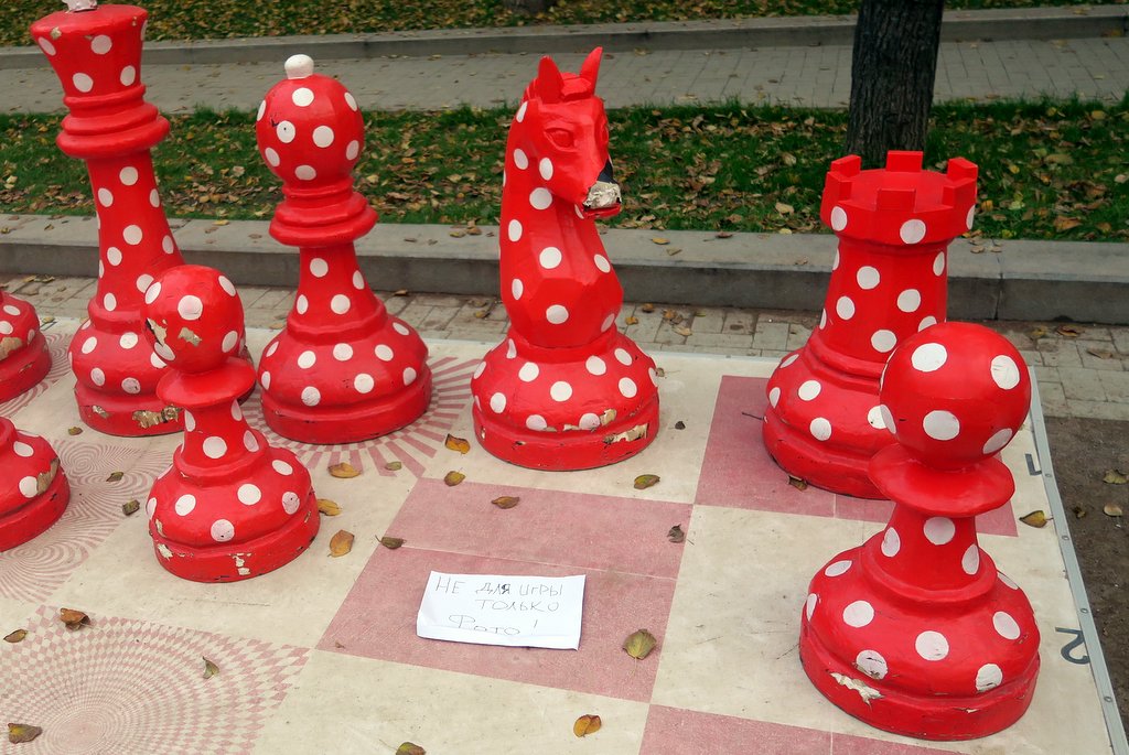 Рядом с ними сидели охранники, которые вяло продублировали запрет на игру. "Эти шахматы своё отыграли," сказал парень. Пенопластвые фигуры и в самом деле были не в лучшей форме. Но мы пообещали, что будем предельно осторожны, и парень больше не возражал. Правда на второй же ход, прибежали дети, и стали фигуры расставлять обратно по местам. Может они тоже были на зарплате у мэрии?..