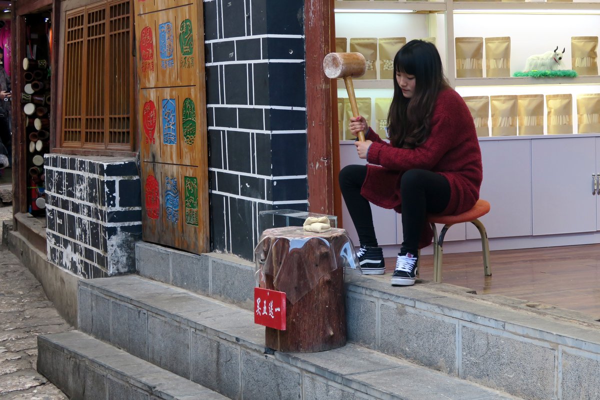 12 Девушка вяло отбивает тесто молотком. Я так и не понял цель этого. В Сиане молотками орудуют намного колоритней!