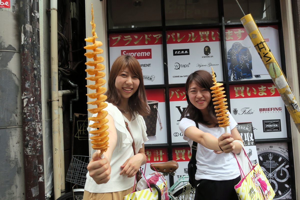 А как вам такая уличная еда? Наблюдал за этим в Осаке. Вырезали из картошки тоненькую сприраль, окунули в тесто, и жарим.