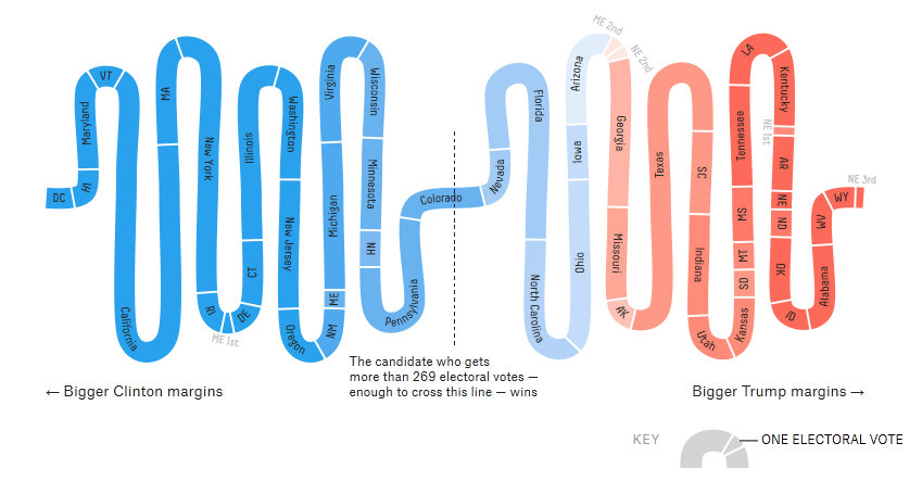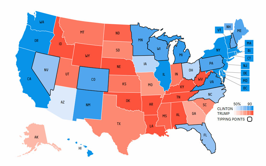 Если взять поштатное голосование, то картина выглядит примерно вот так (синие штаты на карте за Клинтон, красные - за Трампа):