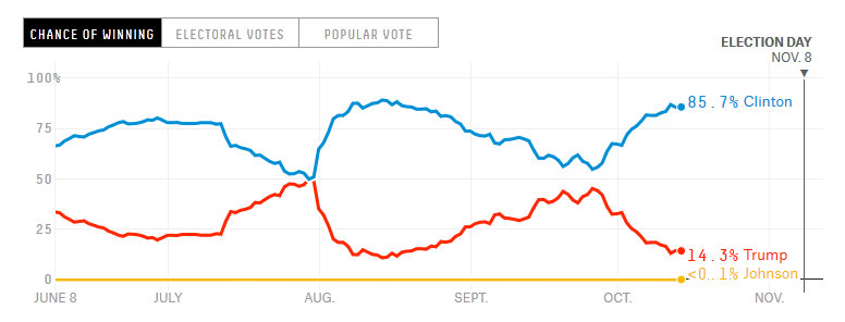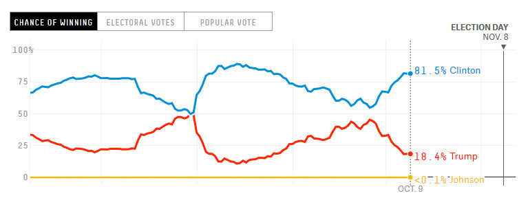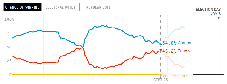Последний раз я писал о кампании прямо перед первыми дебатами между Клинтон и Трампом. Тогда он был очень близок к ней по опросам, в некоторых даже лидировал. На fivethirtyeight счёт 54% к 45%.