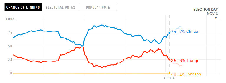 Как же получилось, что Трамп так сильно отстаёт, когда только в конце сентября он набирал популярность? Вот график шансов кандидатов - тут видно, что кривые, которые сейчас довольно далеко друг от друга, почти соприкосались пару раз.