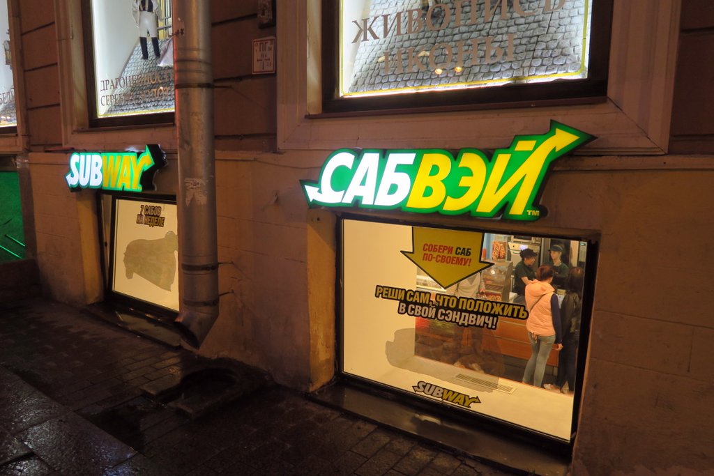 Убогая русская версия логотипа Subway. В английской версии стрелочки вылезают из букв, натурально продолжая их. А по-русски эти стрелки ни к селу ни к городу, просто торчат из странных мест.