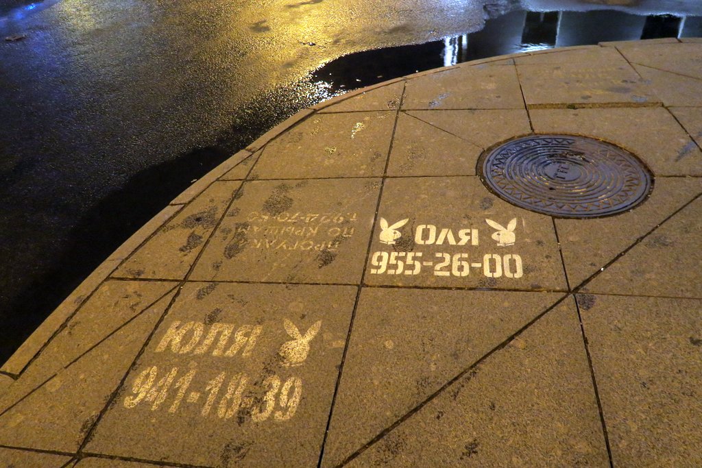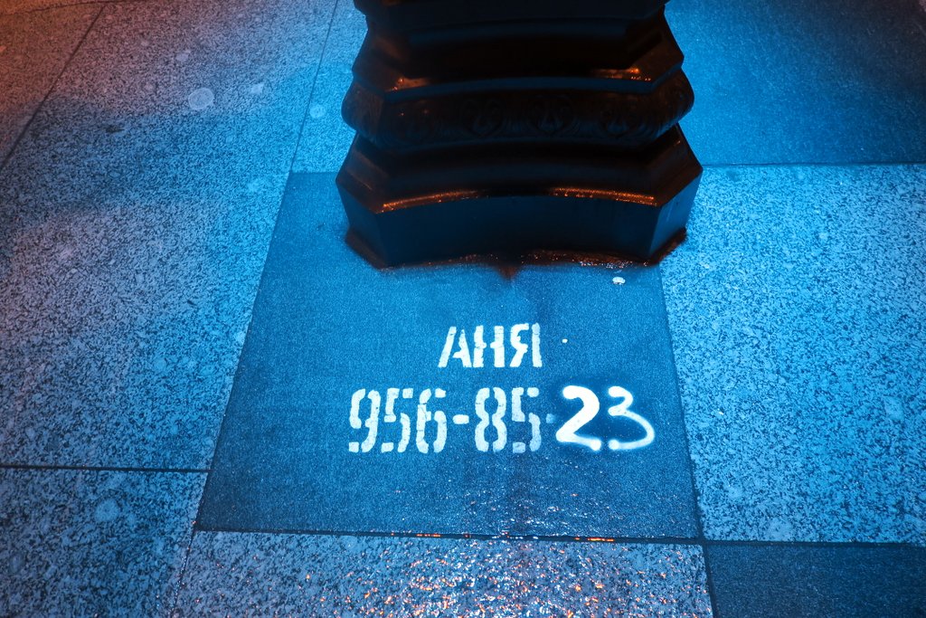 Власти с такой рекламой борятся довольно своеобразно - замазывают номера. То есть главное не тротуар почистить, а чтоб по рекламе не позвонил никто не дай бог. Вот так Аню замазали.