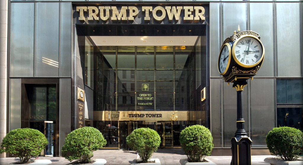 Трамп любит помечать свои владения своей фамилией. Обычно она пишется блестящими позолочеными буквами на самых престижных объектах недвижимости. Вот например Трамп Тауэр: