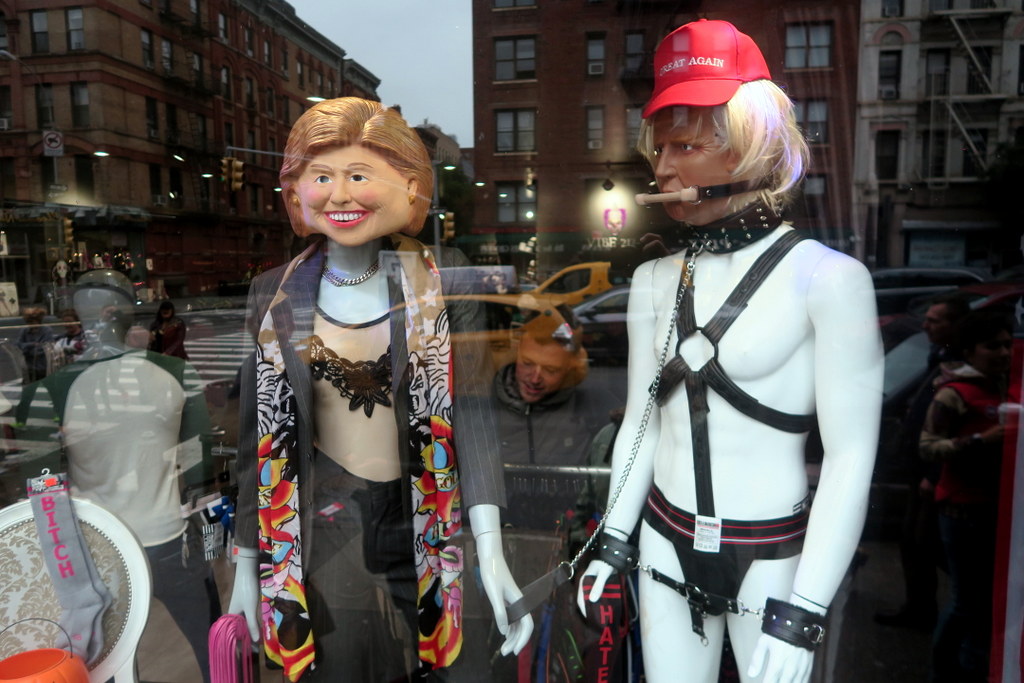 Снова недалеко от работы: Трамп и Хиллари в витрине секс-шопа. Так как это район Челси, секс шоп имеет явно гомосексуальный уклон. Кто из этой сладкой парочки лестней изображён?..