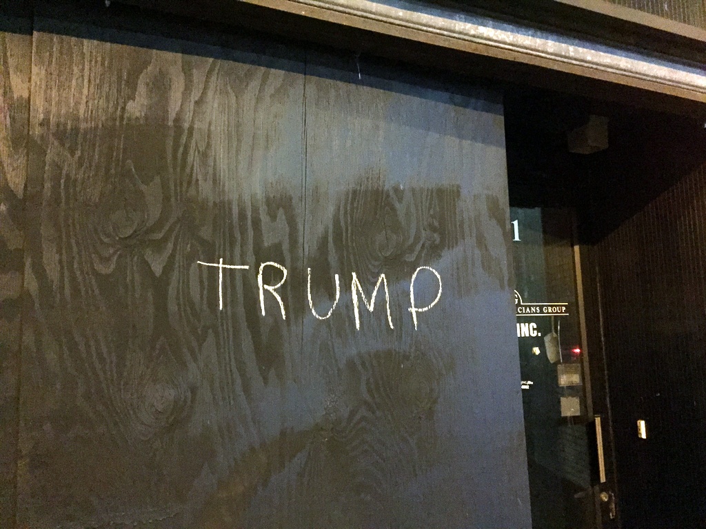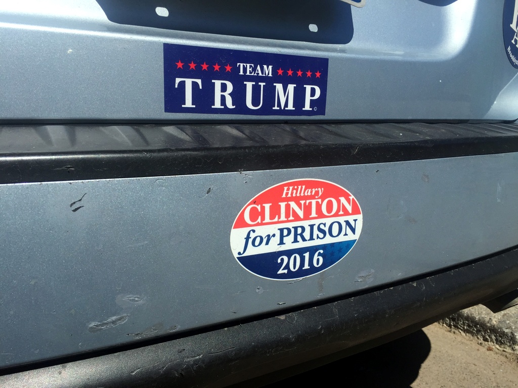 То есть Дональт оставил свой след на нашем ландшафте. В общем есть в городе люди, которые его поддерживают. Вот например наклейки на машину: "Трампа в президенты, Хиллари в тюрьму".