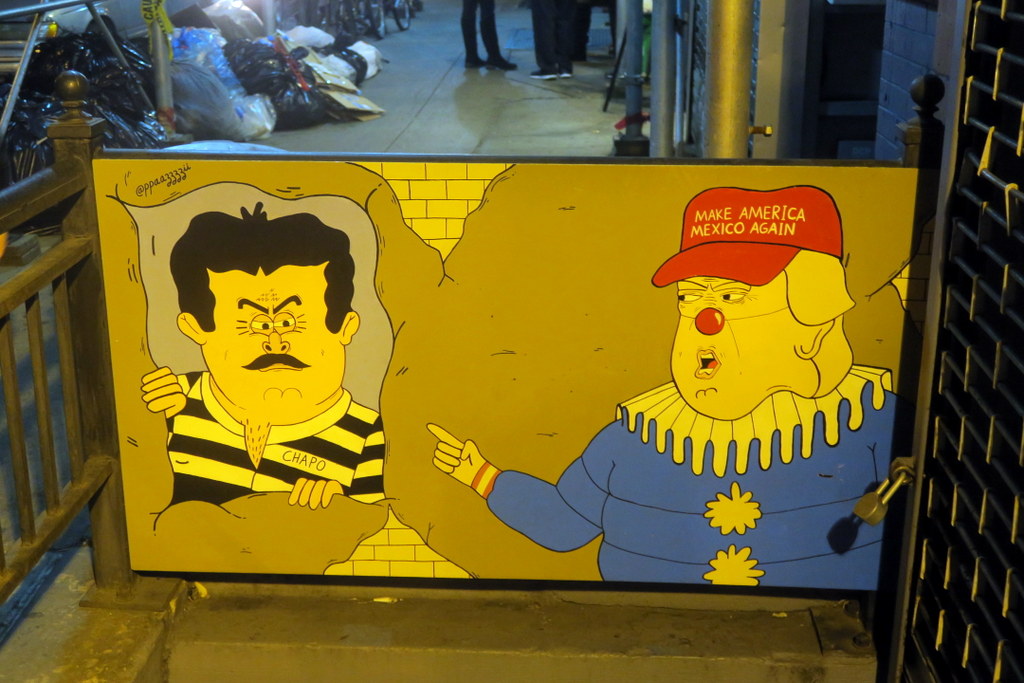 Работа другого художника: клоун Трамп построил стену, под которую произвёл подкоп Эл Чапо. На кепке кандидата написано "сделаем америку снова мексикой" (это породия на главный лозунг трамповской кампании - "сделаем америку снова великой").
