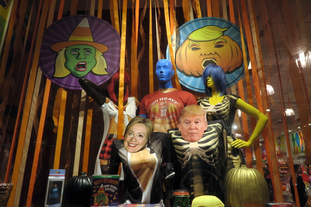 Они же на витрине Хэллоуин-магазина. Больше всего мне тут нравится трамповская причёска на тыкве.