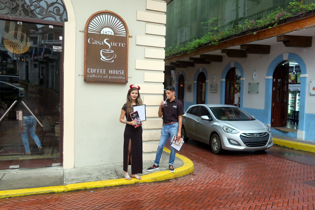 Молодые симпатичные зазывалы перед дорогими (по панамским меркам) кафешками. Кофе здесь невкусный.