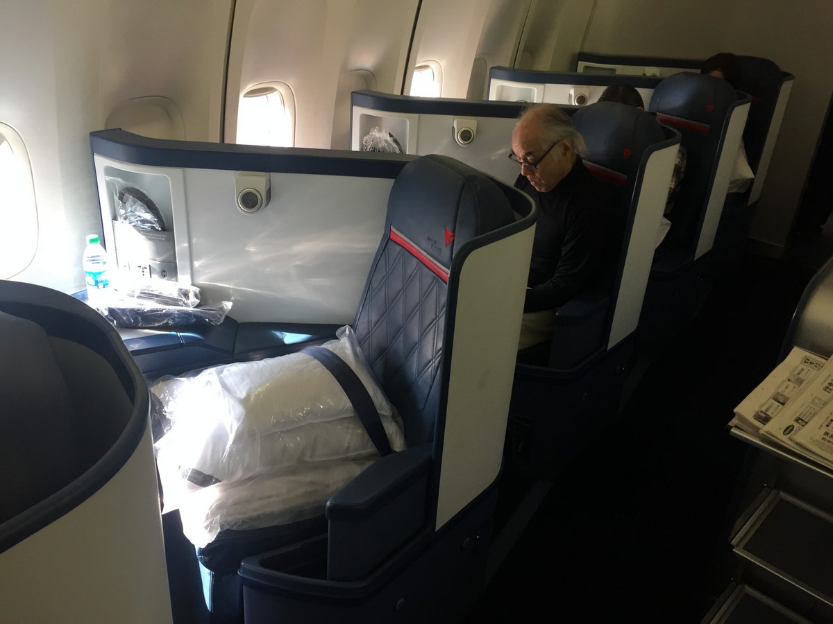 Я лечу через Токио, на одном из Боингов 747, которые Дельта унаследовала во время слияния с авиакомпанией Northwest Airlines. Эти самолёты двухэтажные, и кабина пилота наверху. А в носовой части первого этажа сидения сходятся к самому переду. Впервые такое вижу.