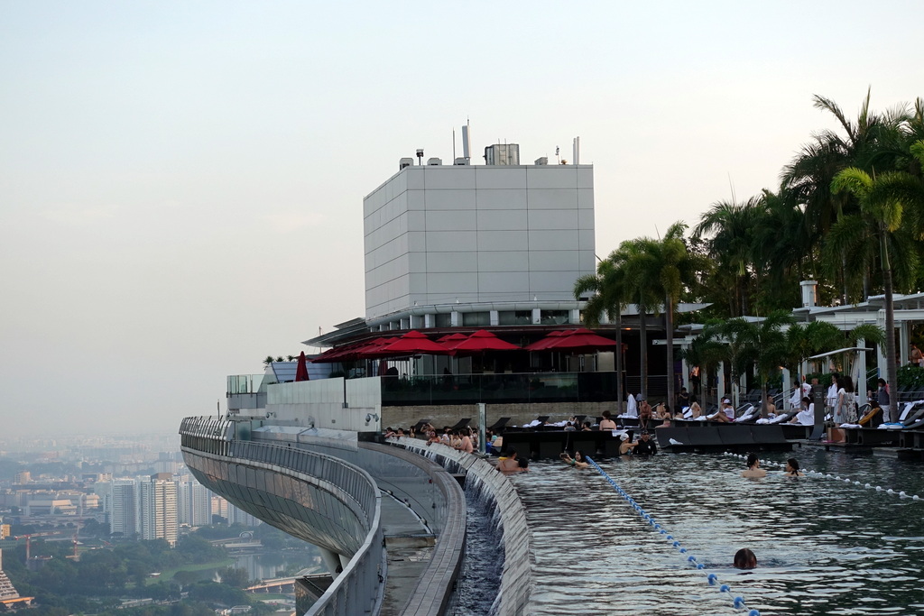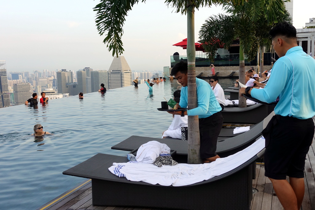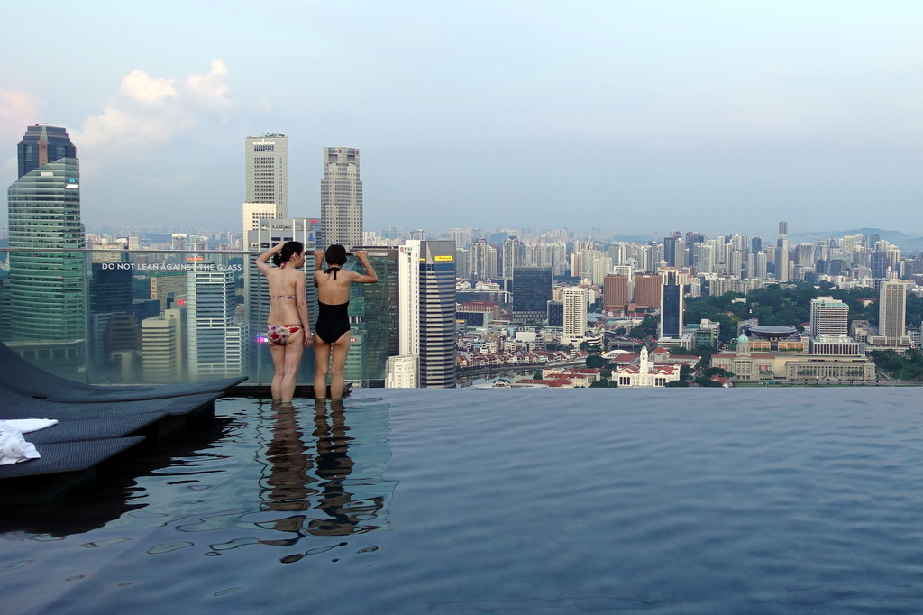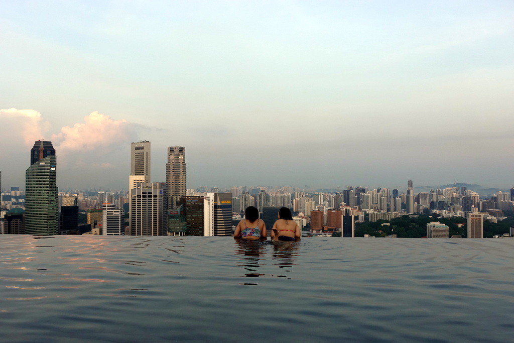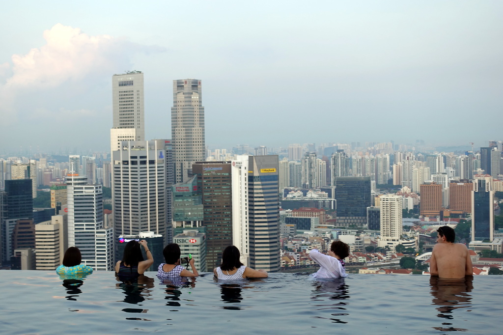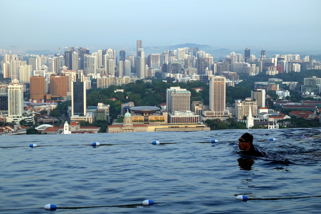 5. Вид с бортика бассейна конечно очень сильно впечатляет. Под вами открывается весь залив Marina Bay (не будем забывать, что он искусственный), и небоскрёбы даунтауна.