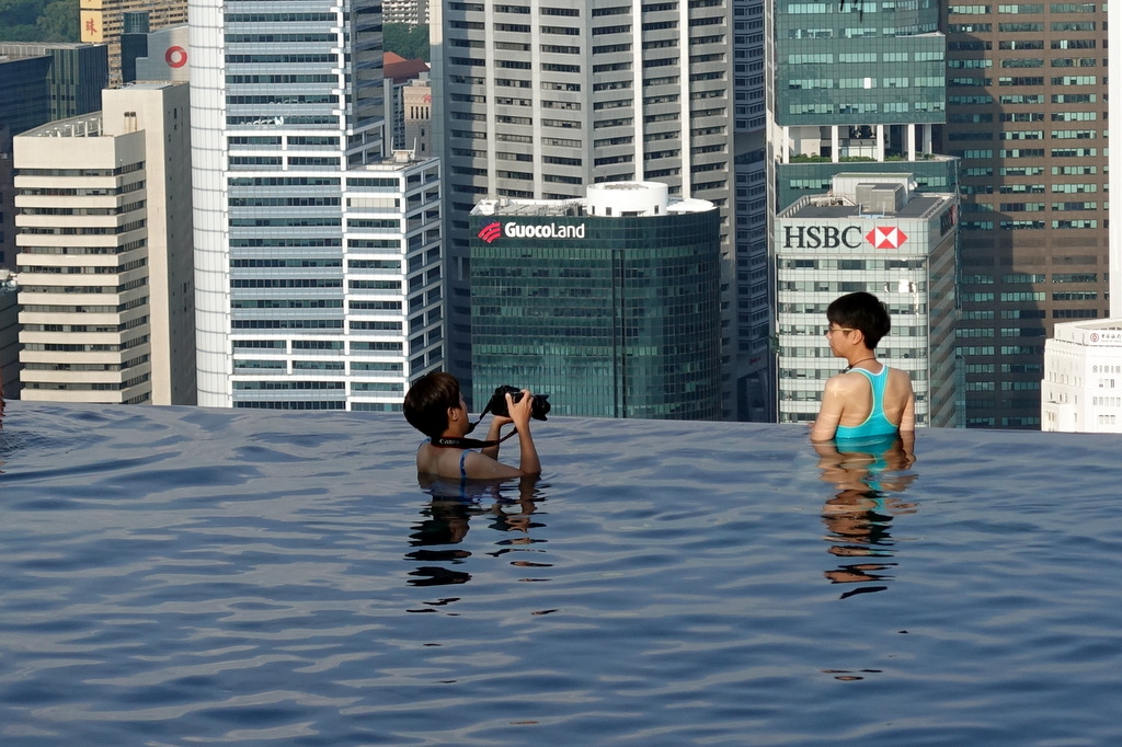 Ладно, это всё тоже мелочи. Вот - главная картинка бассейна. Люди у бортика, смотрят с огромной высоты на город. Кажется, что между краем воды и пропастью ничего нет. Дух захватывает.