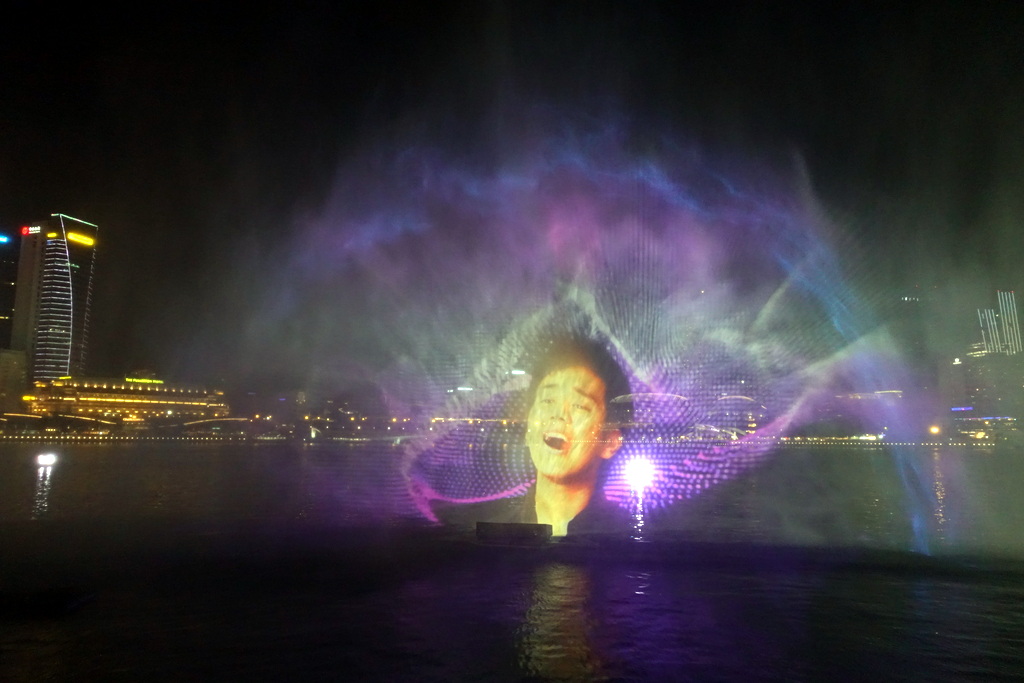 Самое крутое - недалеко от берега работают фонтаны-распылители, а на мелкую водную пыль, которую они создают, идёт проекция видеоряда. Результат - призрачные картинки, которые колышатся казалось бы прямо в воздухе. Всё это под музыку конечно.