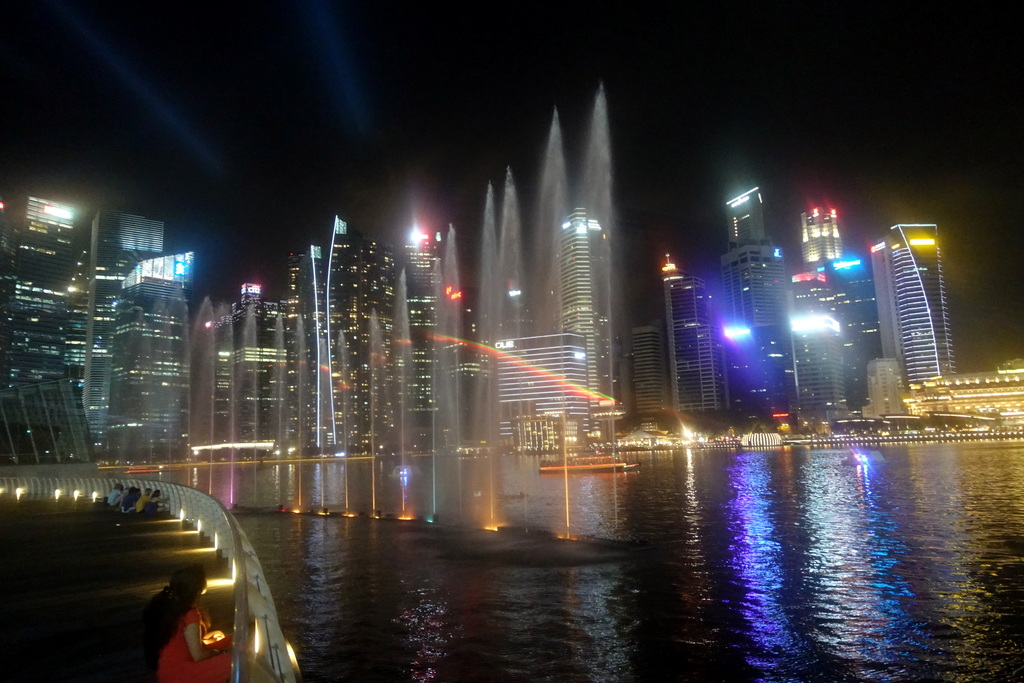 Но на них лучше смотреть с противоположного берега залива - это совсем другое зрелище создаёт. Правда фонтанов отсюда почти не видно. К счастью каждый вечер проводится два представления, так что можно успеть посмотреть с двух ракурсов. (Каждое шоу длится минут пятнадцать, так что много времени это не займёт.)