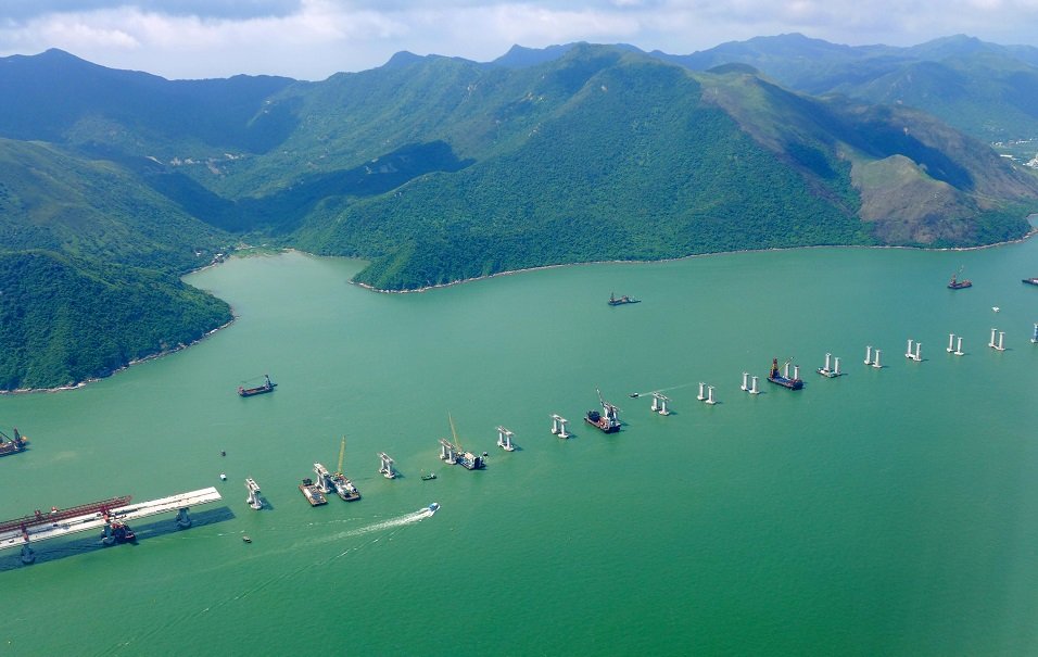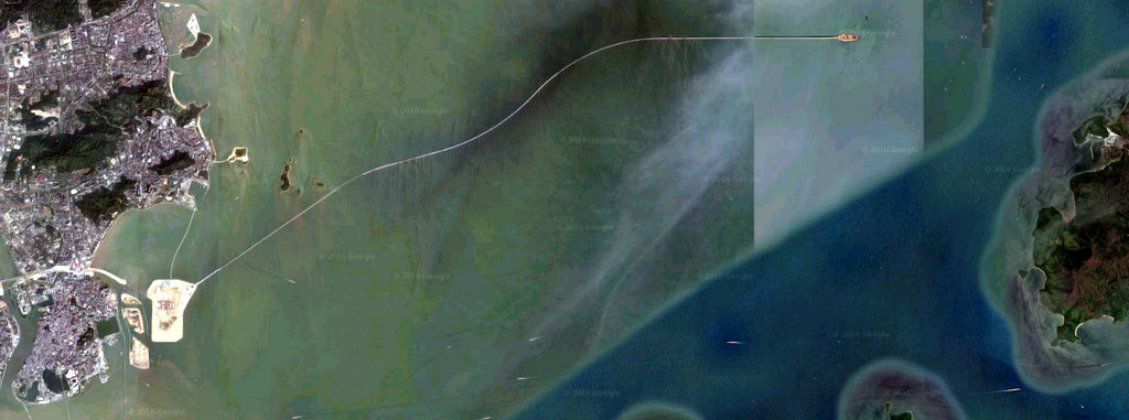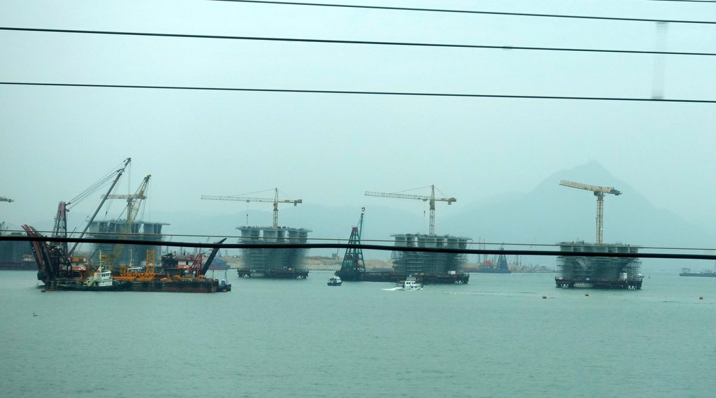 Вот как выглядит строительство у берегов Лантау с воздуха. Этот проект запустили в 2009 году, и должны были завершить в декабре 2016, но стройка затянулась ещё как минимум на год. Хотя все опоры закончили строить ещё в июне, они не везде соединены дорожным полотном.