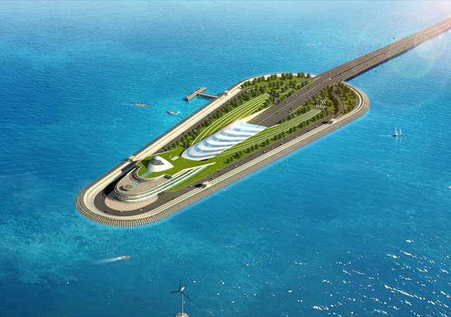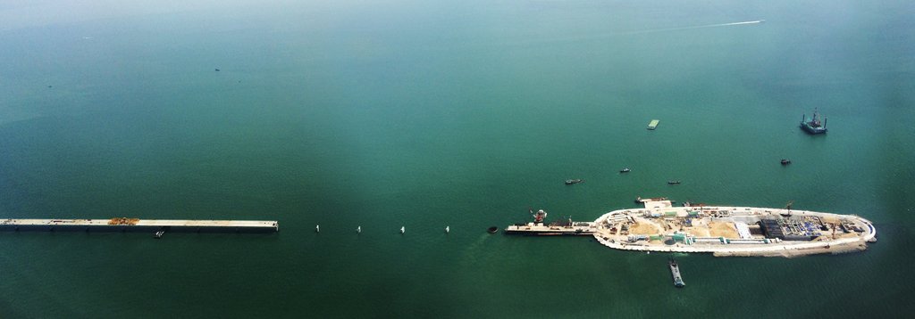 Для полного воплощения этого мега-проекта, китайцам пришлось создать четыре острова! Два из них небольшие, посреди моря - они послужат въездами в туннель. Вот так в 2014 году выглядел остров со стороны Макао: