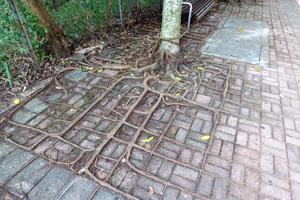 15. Около выхода из этого парка Тоня обратила моё внимание на корни баньяна, которые проросли поверх тротуарной плитки аккуратными прямоугольниками.