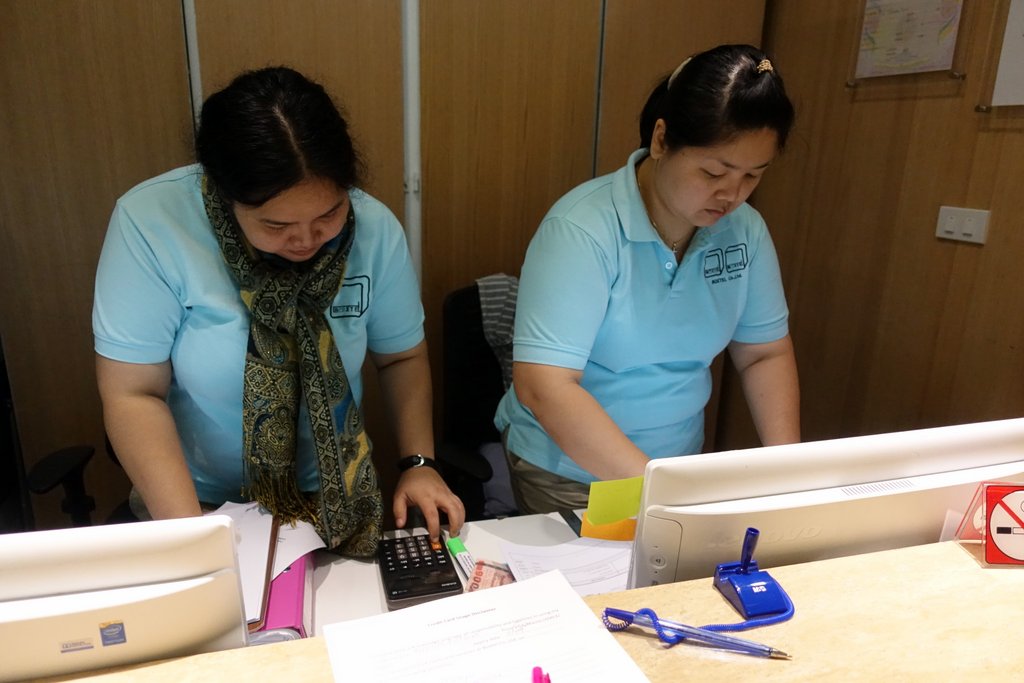 Тут нами занялись сразу две работницы. Процесс регистрации занял неоправданно долго. Когда я бронировал эти боксы, со мной связались по имейлу, и выяснили заранее все детали. Но тут на стойке всё пришлось повторять. Почему-то у них в системе было записано, что мы остаёмся на четыре часа, хотя я несколько раз подтвердил, что шесть.