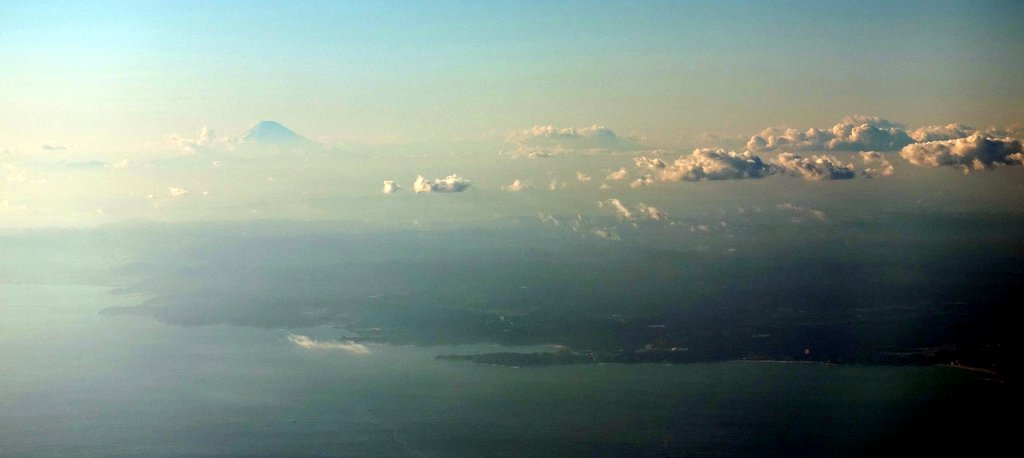 Подлетаем к Японии. На горизонте виднеется пик горы Фудзи. Трудно поверить, что пол года назад я стоял на его вершине и встречал рассвет. Сейчас вершина полностью покрыта снегом.