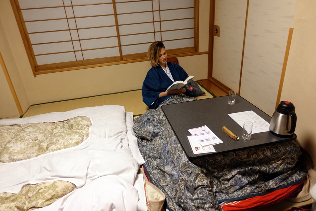 12. На ночь мы сняли рьёкан - традиционный японский отель. Здесь в комнатах лежат соломенные татами, а гостям предлагают переодеться в халаты юката (не стоит путать их с кимоно.)