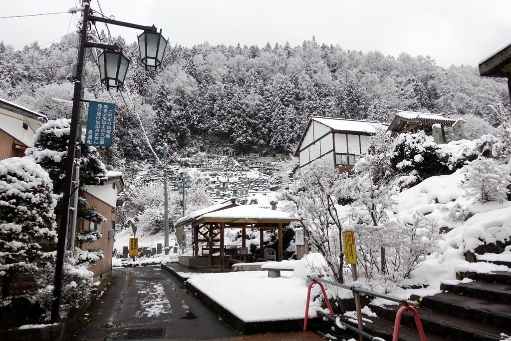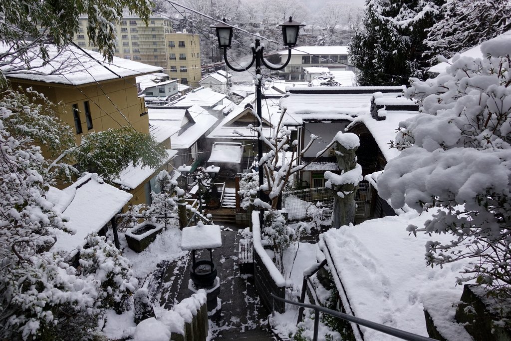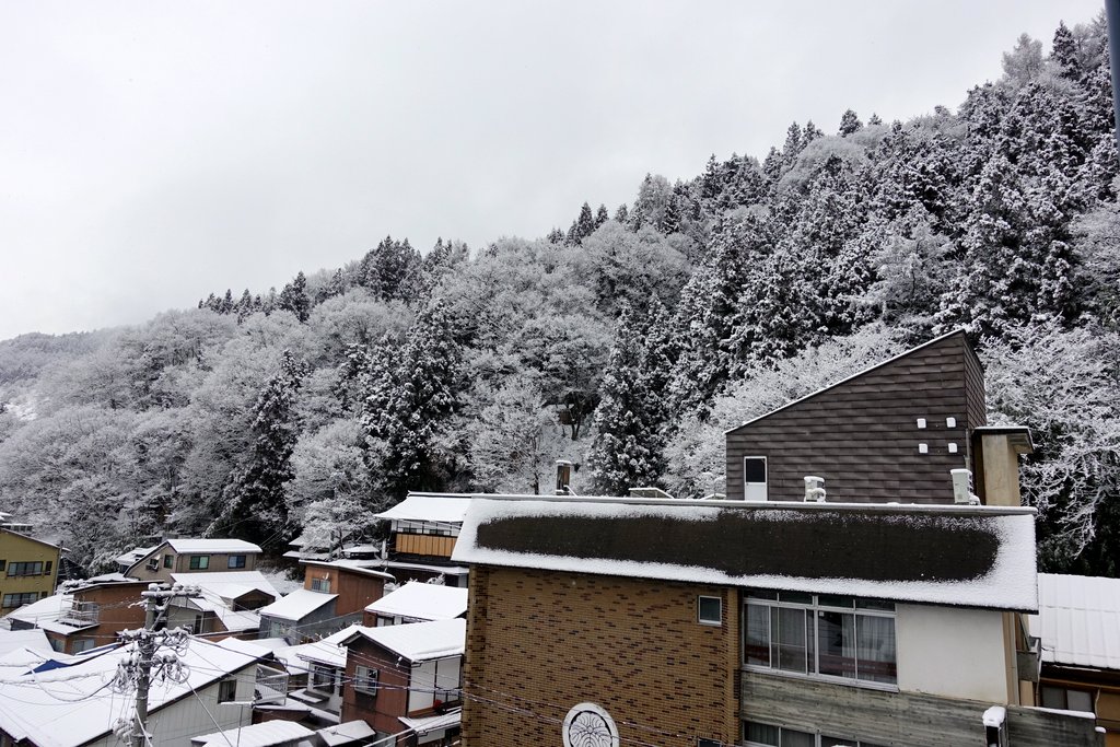 13. Сибу-Онсен окружён горами, покрытыми лесом. Всё это завалило снегом, выглядит очень красиво.
