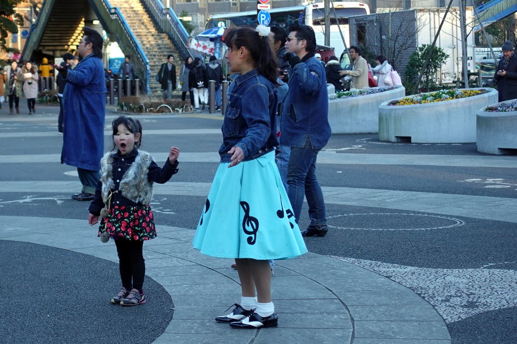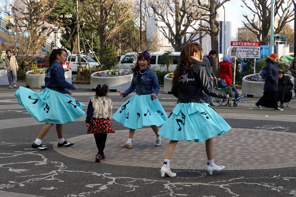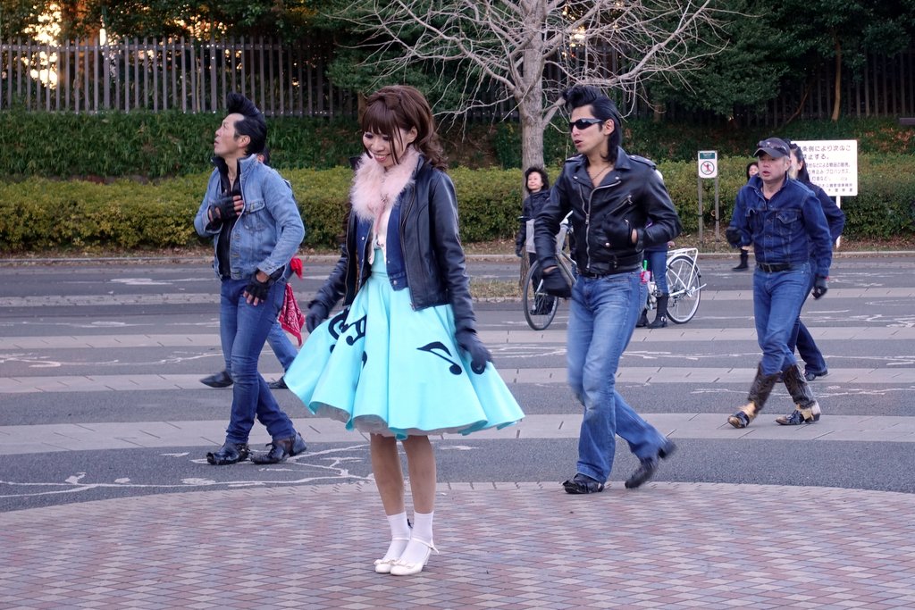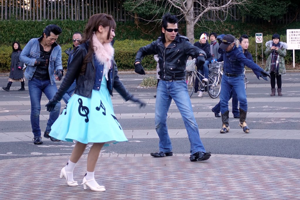 1. К парку Ёёги мы пришли в воскресенье, в районе пол-третьего. Уже подходя к пятачку, где обычно танцует клуб рокабилли мы услышали весёлую музыку. Значит танцуют, не взирая на погоду! Но когда мы увидели танцующих, пришлось немного удивиться. Вместо привычных парней в чёрных кожаных куртках, на площадке танцевали девушки в развевающихся юбках, белых чулочках и прочих атрибутах американских старшеклассниц середины XX века!