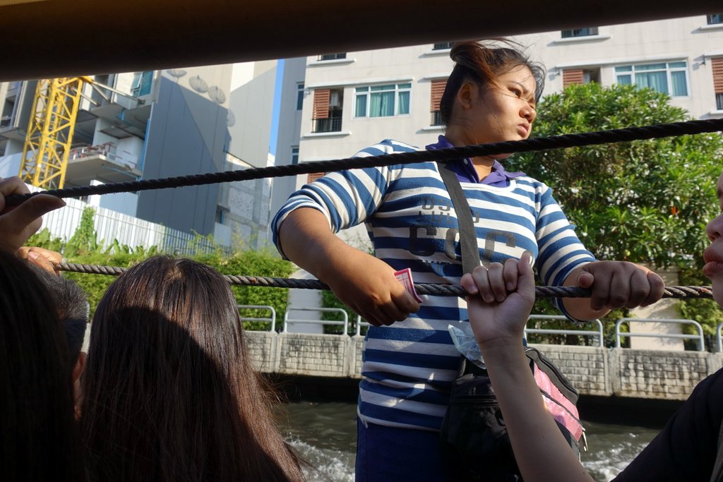 30 Это смелые люди, которые очевидно не боятся ядовитой воды канала. Когда катер подходит к причалу, кондуктор с нужной стороны выпрыгивает и держит его у берега, пока пассажиры выходят и заходят. В то же время замечает новеньких. Потом между остановками проходит и собирает со всех деньги. Тут система честности - даёшь деньги в соответствии с тем, как далеко ехать надо. По моему никто не проверяет.