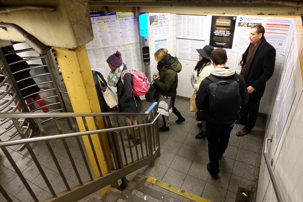 43. В метро очередь к турникету. Он в этом входе один, и его считыватель магнитных карт постоянно барахлит. К сожалению, нью-йоркское метро перешло на карты в 1990х, тогда магнитная полоса была последним писком технологии. Вот и мучаемся теперь с этими картами, тогда как системы, которые подождали десять лет, сразу прыгнули на бесконтактные.