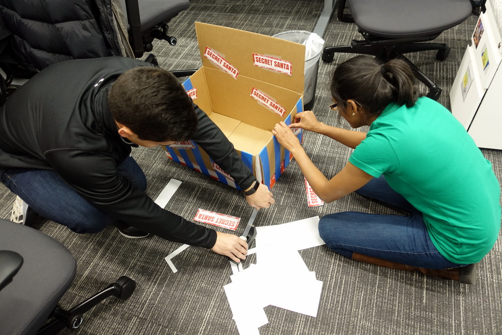 26. Коллеги лепят коробку, куда мы будем складывать подарки от "Секретного Санты". Она должна быть праздничной!