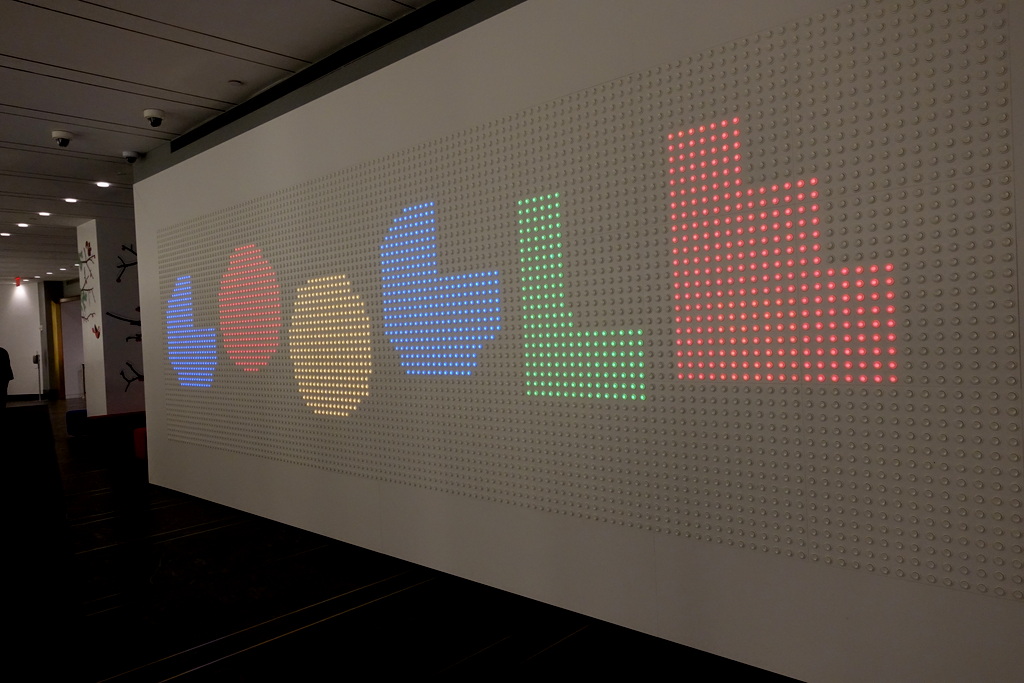 17. В лобби стоит огромный интерактивный дисплей. Каждый пиксель на нём - кнопка, если на неё нажать буквы прыгают, растут, сдуваются. Раз в несколько минут всё меняется: цвета, шрифты, поведение букв. Неизменным остаётся лишь то, что надпись всегда гласит "Google".