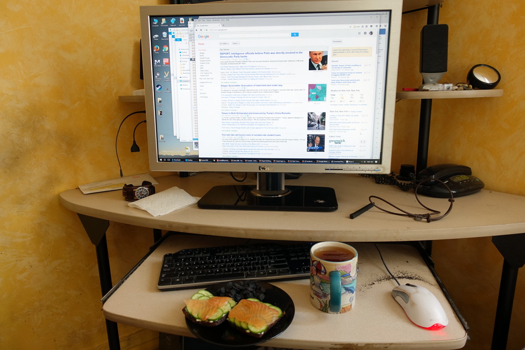 6. Ха-ха! Нет конечно. Как и все нормальные люди я завтракаю за компом. Тут я читаю новости, узнаю, что произошло за ночь в мире, в США, в Нью Йорке и в рунете. Сегодня русские хакеры опять взломали выборы, а Трамп объявил об ещё одном назначении в будущий кабинет. На сладкое - комментарии из блога. Читаю все, отвечаю на многие. Это пожалуй любимая часть ведения ЖЖ.