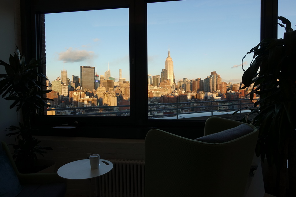 35. По пути назад к рабочему столу замечаю, что заходящее солнце очень красиво подсвечивает мидтаун. Сейчас самая зима, темнеет рано, ещё чуть больше недели, и будет самый короткий день года.