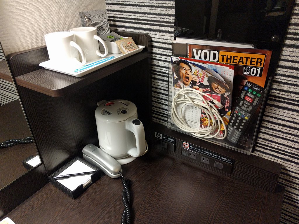 16 Несмотря на крохотные размеры комнат, тут есть абсолютно всё,что нужно! Японцы умудрились напихать в эти крошечные кельи больше всяких плюшек, чем встретишь в обыкновенном отеле. Ну, компактность - это они умеют. Вот например в ячейках в столе и под полочкой для чемодана спрятаны чаиник, и даже холодильник! Мини-бары для бизнес-отеля редкость, зато можно купить что-то в магазинчике и сохранить в холоде пару дней.