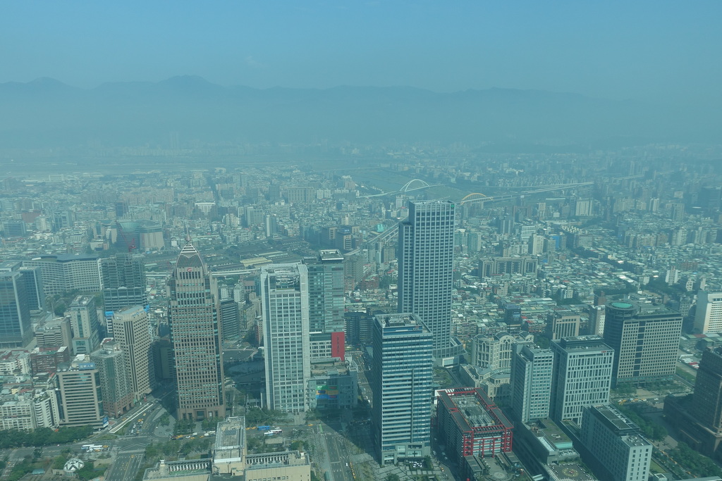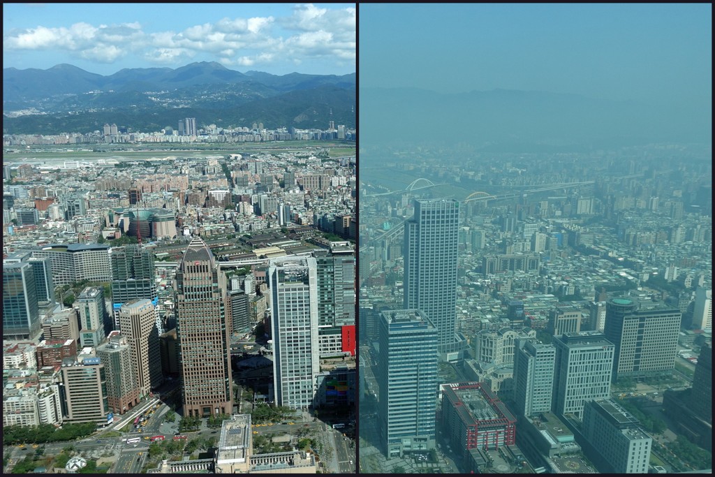 Меня тут спросили, насколько загрязнён воздух в Тайбэе. Вопрос резонный, ведь в городе полно мопедов, которые, как известно не отличаются особой чистотой выбросов. Так вот воздух тут очень разный бывает. Предлагаю вам сравнить два вида из окна нашего офиса. Вот эту фотографию я вам уже показывал, я её снял в среду.