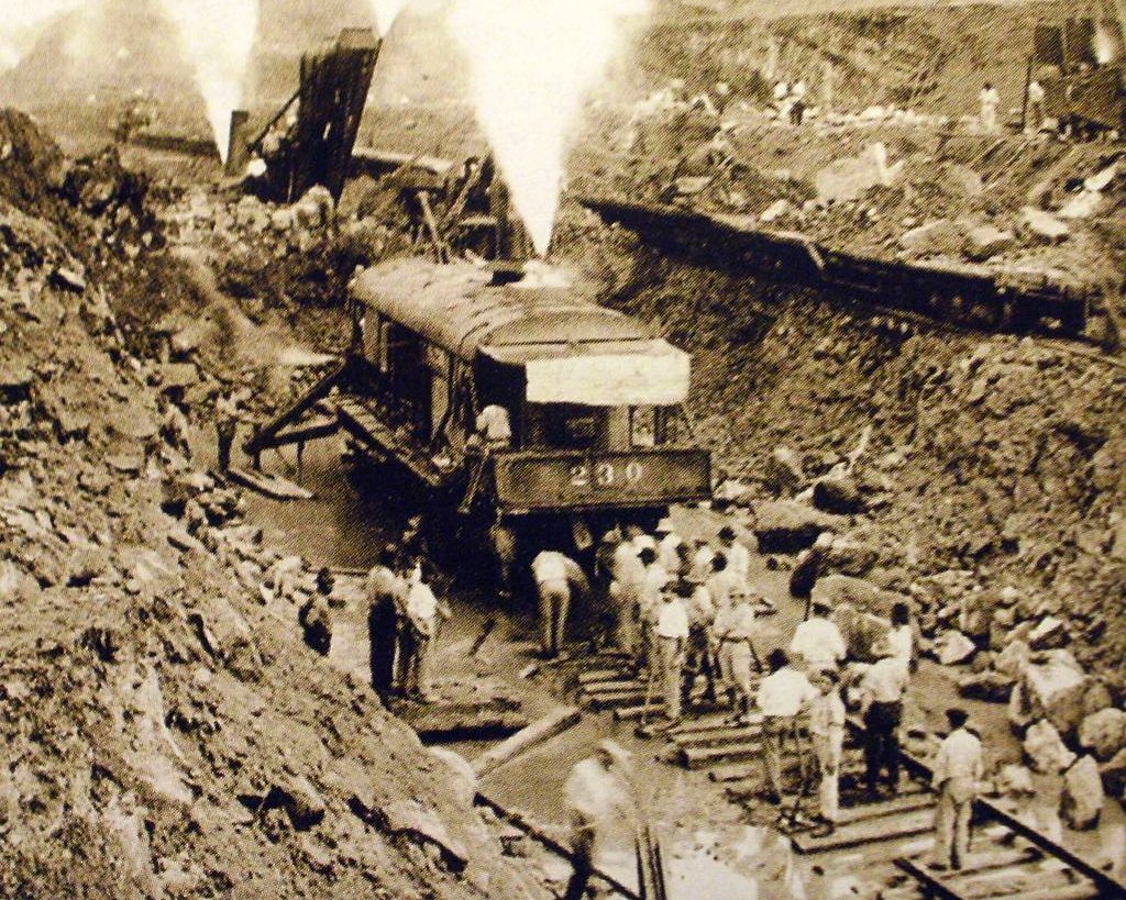 А чтобы ещё ускорить процесс, американцы решили построить первую железную дорогу между двумя океанами. Её строительство длилось несколько лет. Это была первая супер-стройка в мире. Впервые в столь масштабном строительстве в ход пустили паровые технологии, хотя и очень примитивные. Чтобы проложить пути, инженерам пришлось срыть кусок горы высотой от 6 до 12 метров через хребет американского водораздела. Позднее именно это место станет самым трудным во время строительства Панамского Канала.