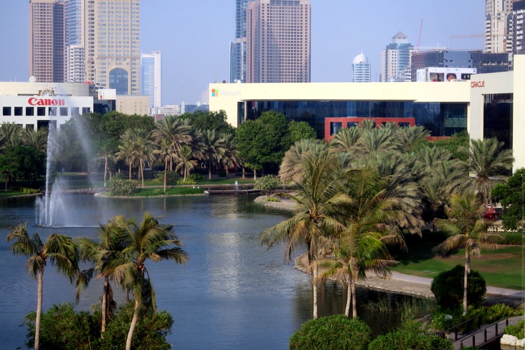 Дубай. Меня немного разочаровало, что здесь Гугл не снял пару этажей в самом высоком здании мира. Ну что делать, к хорошему быстро привыкаешь. Но, как оказалось, тут есть специальный район, где кучкуются все IT-компании. Вот на них то у нас и вид. Здесь Canon, Microsoft и Oracle.