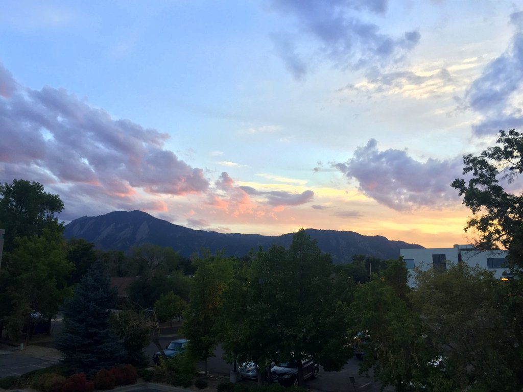 А это Боулдер, штат Колорадо. Никаких небоскрёбов тут нет и в помине, наши двухэтажные здания, чуть ли не самые высокие в округе. Зато с задней веранды открывается прекрасный вид на уникальны горы Flatirons - вот здесь они поближе видны.