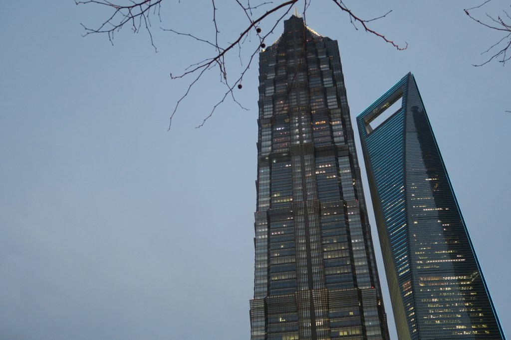 А это уже вид из отеля, на 20 этажей выше в том же здании. Здесь видна вершина соседнего небоскрёба, Цзинь Мао. В прошлом году я пару дней катался из офиса на 60м этаже в отель на 80м!