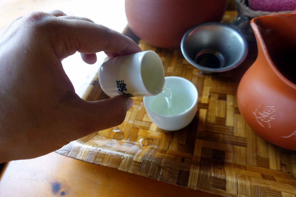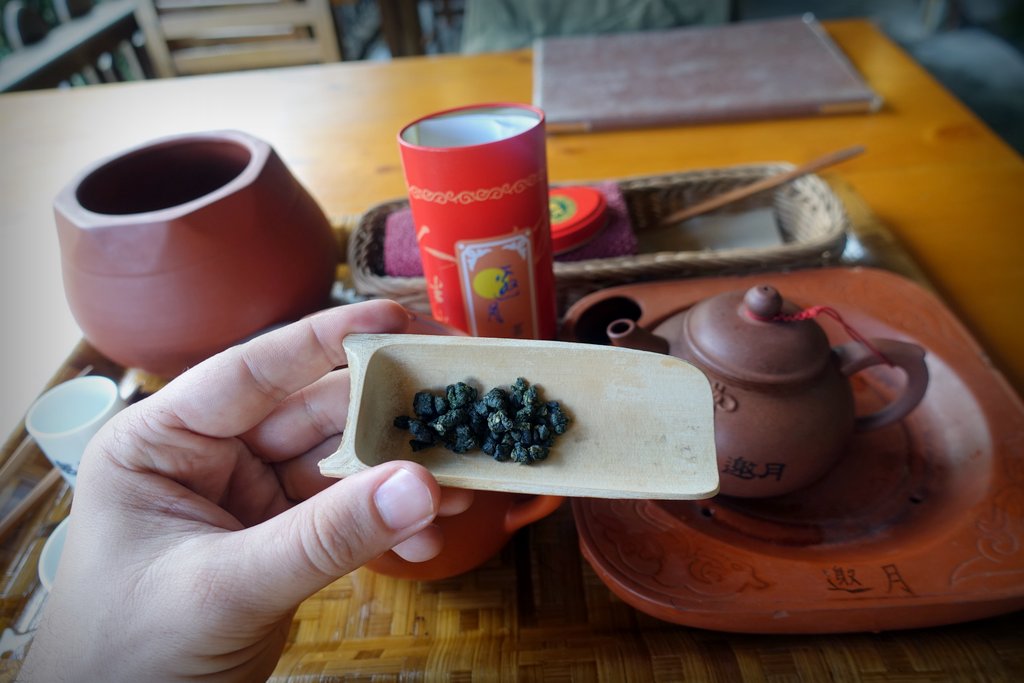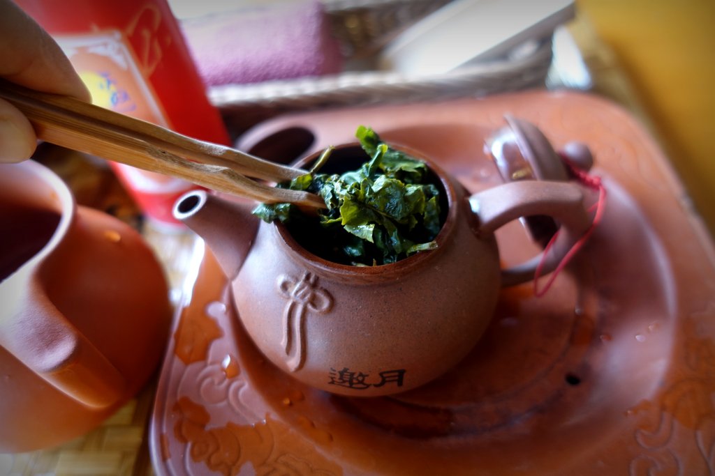 12 Теперь можно и чай класть. Делается это специальной лопаткой из бамбука. Тайвань славится своим улунским чаем. Это нечто между чёрным и зелёным. Вы знали, что все виды чая происходят от одного типа растения? И что различаются только процессом обработки и подготовки? Зелёный просто сушат, а чёрный чай проходит через процесс ферментации, после которого при заваривании получает свой ядрёный вкус. Так вот улун - это наполовину ферментированный чай.