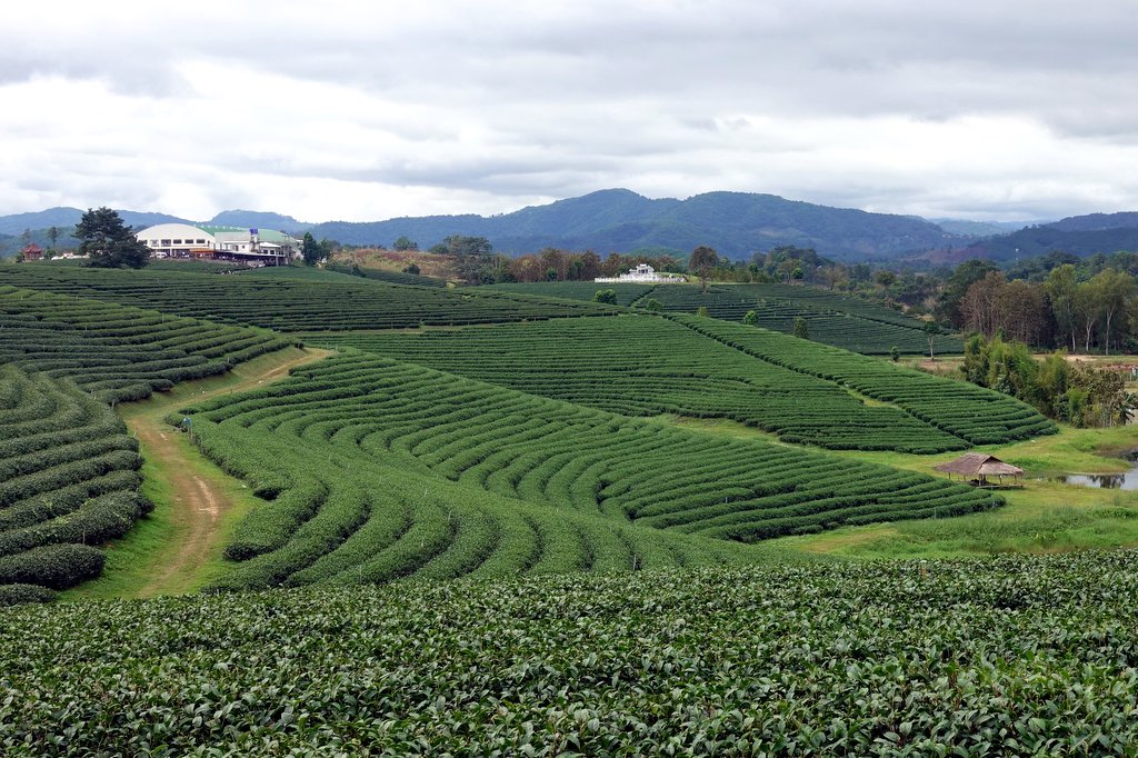 2 Вы когда-нибудь видели, как растёт чай? Я до недавнего времени тоже нет. А он оказывается растёт на рядах аккуратных кустиков. Вот фотография огромной чайной плантации на севере Таиланда: