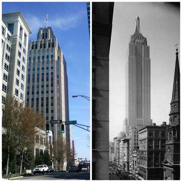 Правильно, это знаменитый Эмпайр-стейт-билдинг. Если посмотреть на два здания бок о бок, то сходство очевидно (главная разница в шпиле, но к нему мы ещё вернёмся):