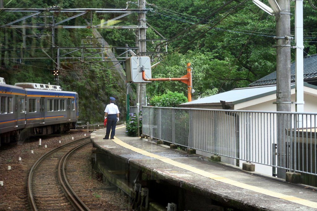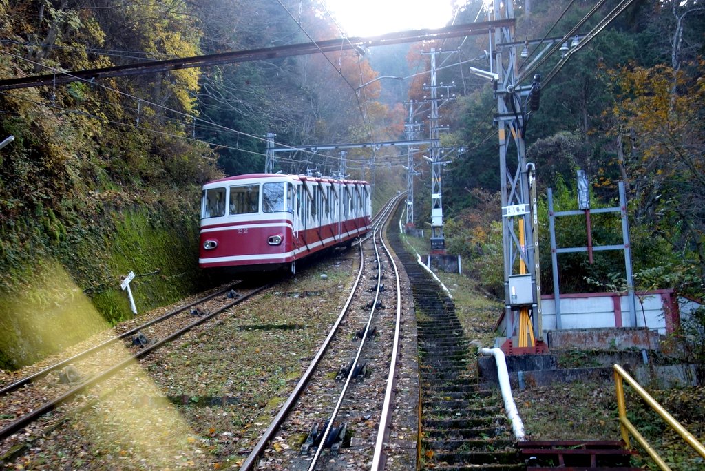 7 Остановка Коя-сан конечная на этой линии, но мы ещё не у цели. Теперь нас ждёт подъём вверх на горном фуникулёре - трамвайчике, который ходит под наклоном. Впрочем расписание довольно хорошо синхронизировано с прибывающими поездами.